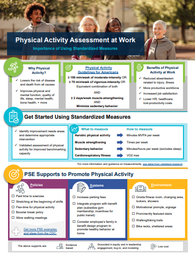 We are thrilled to share with you some exciting resources developed to standardize the assessment of physical activity and sitting time in the workplace. The Physical Activity Alliance and the Physical Activity Policy Research and Evaluation Network (PAPREN), along with numerous key stakeholders in the workplace sector, have developed these resources to summarize standardized criteria for physical activity, physical fitness, and sedentary behavior.