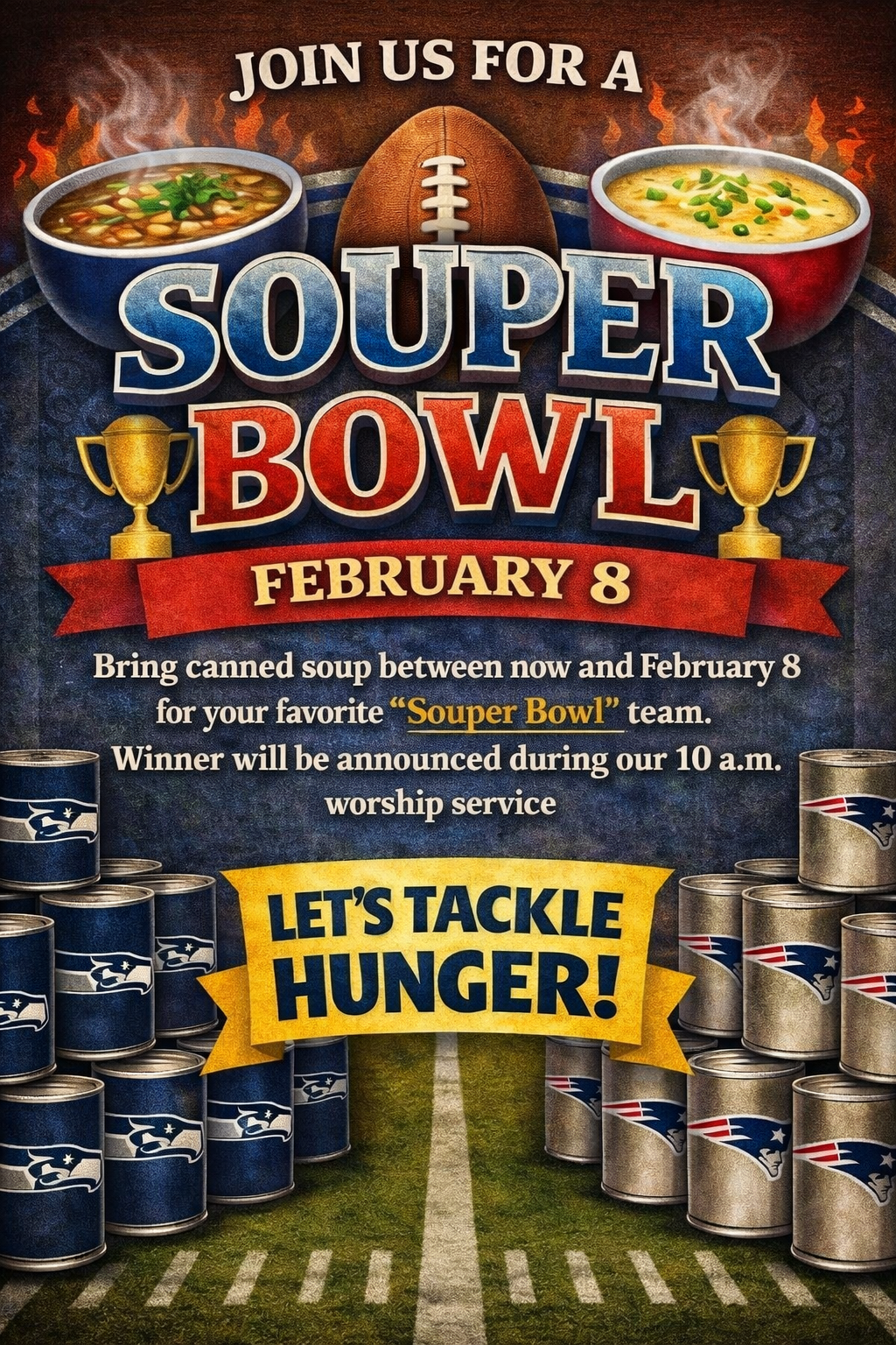 Seahawks vs. Patriots! Bring your donations, choose your side, and help us see which team can score the most cans for our pantry. A little friendly rivalry for a great cause.