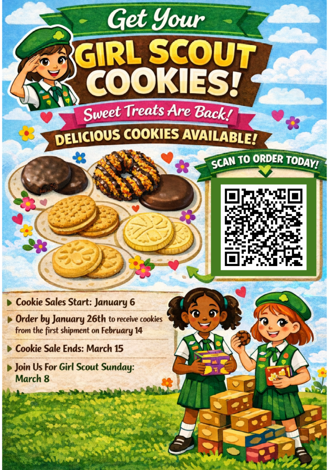 Once the cookies arrive, they may be delivered to your home or to the church. The Troop Cookie Manager will contact you by text to arrange delivery.