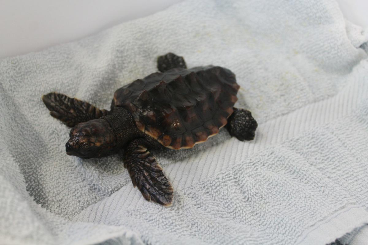 Pip arrived to the Georgia Sea Turtle Center on September 28, 2019. This loggerhead sea turtle hatchling was found in its nest on St. Catherines Island when sea turtle biologists were conducting a nest inventory. A hatchling that is unable to make it out of its nest is called a straggler hatchling. Typically, biologists release straggler hatchlings right away; they walk the hatchlings closer to the ocean and let the turtles crawl into the water on their own. This of course did not happen with Pip. The Georgia Sea Turtle Center is permitted to keep one straggler sea turtle hatchling per year to serve as an educational ambassador for its species. This year, Pip was the turtle chosen to hold that honor!