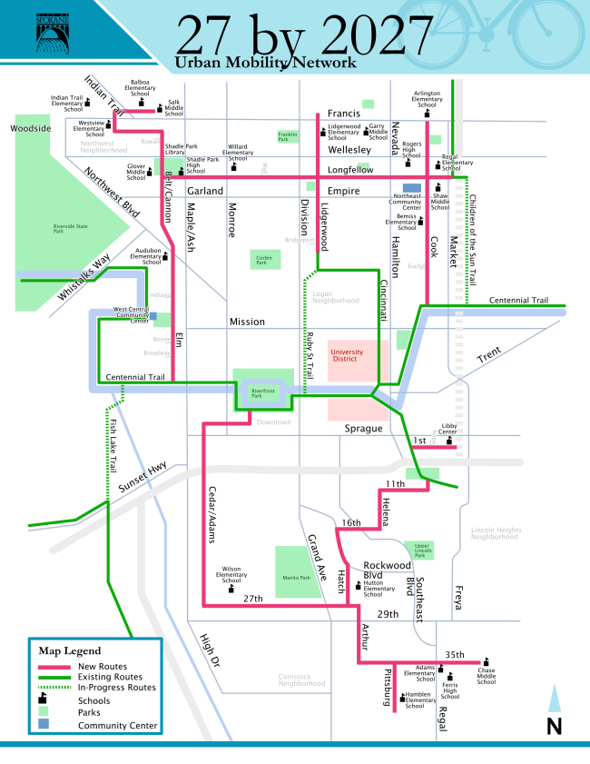 The City of Spokane recently proposed an ambitious goal to build 27 miles of new, connected, comfortable bike routes by 2027. The network will connect people throughout the City directly to major trails such as the Centennial Trail, the Ben Burr Trail, and the Children of the Sun Trail.