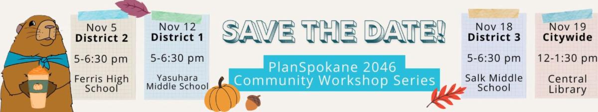 Wednesday, Oct. 22 Public Workshop: The Spokane Plan Commission is tentatively scheduled to hear presentations on the PlanSpokane 2046 growth options.