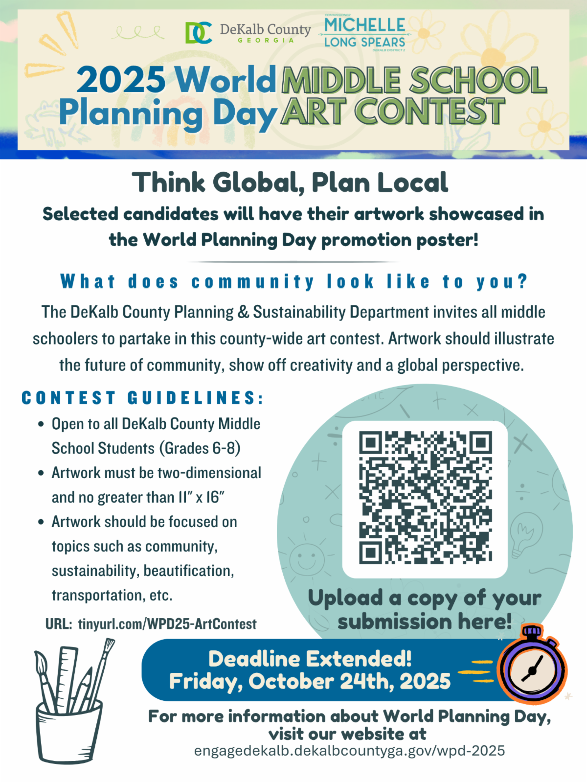 We are excited to announce that World Planning Day is returning this year, bigger and better than ever! This year, alongside continuing to bring community favorites such as food trucks and community partners, we are introducing an exciting opportunity for our DeKalb Middle School students. We are hosting a Middle School Art Contest for students to illustrate the future of their communities while thinking about topics such as sustainability, transportation, and more.