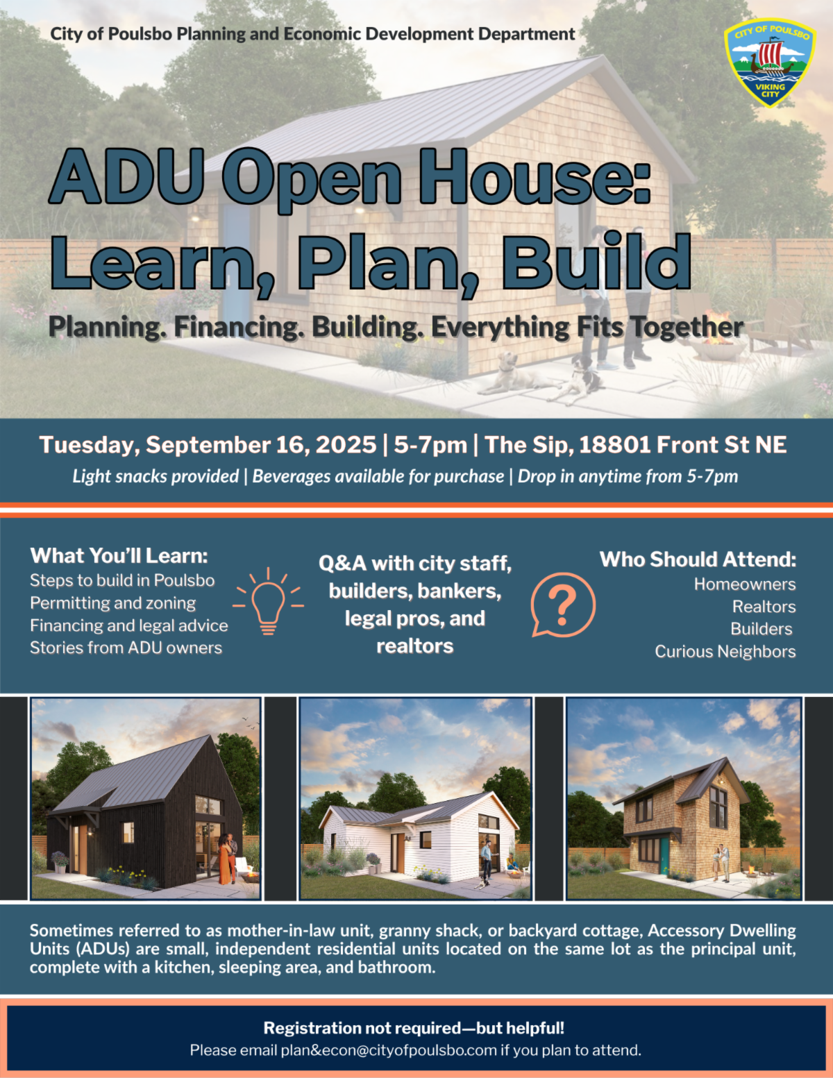 Poulsbo invites residents to an informative and interactive ADU Open House on September 16, from 5 to 7 pm at The Sip (18801 Front St NE). Drop in anytime, grab some light refreshments, and get your questions answered. We kindly request that interested residents RSVP via email to plan&econ@cityofpoulsbo.com.