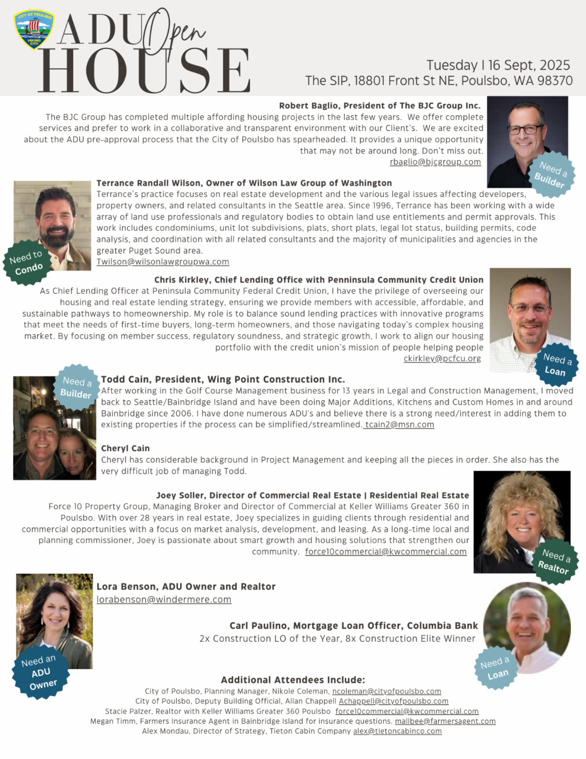 The ADU Open House isn’t about presentations—it’s about conversations. Attendees will have the chance to meet directly with experts, including bankers, builders, real estate professionals, legal advisors, and city staff, along with a homeowner who recently built an ADU in Poulsbo. Confirmed participants include:
