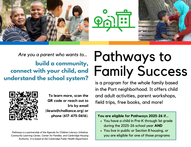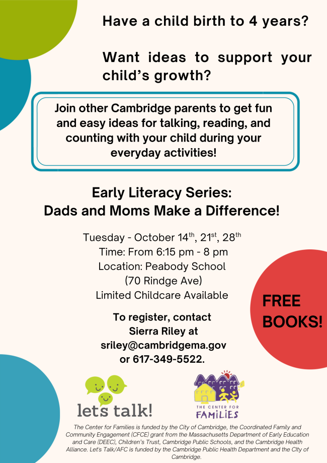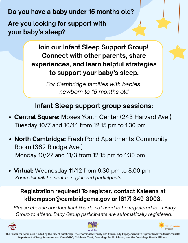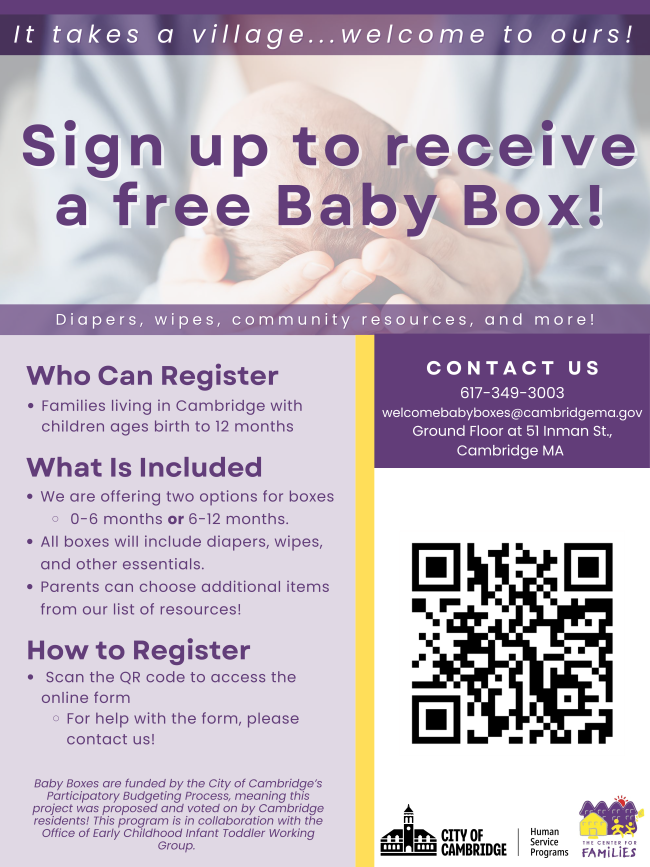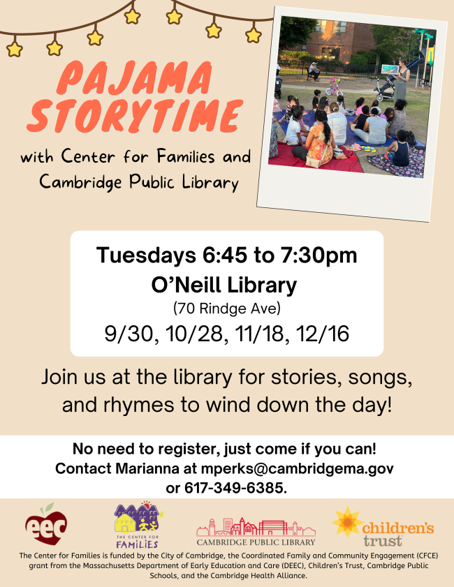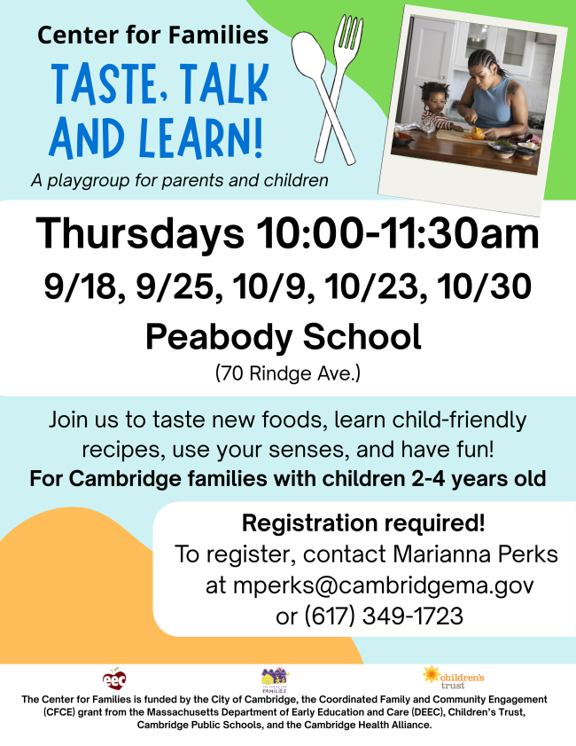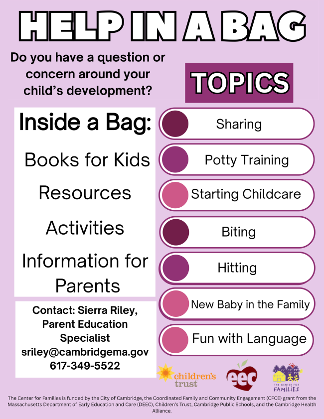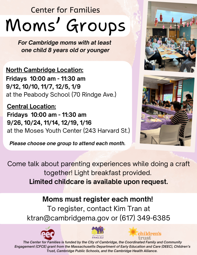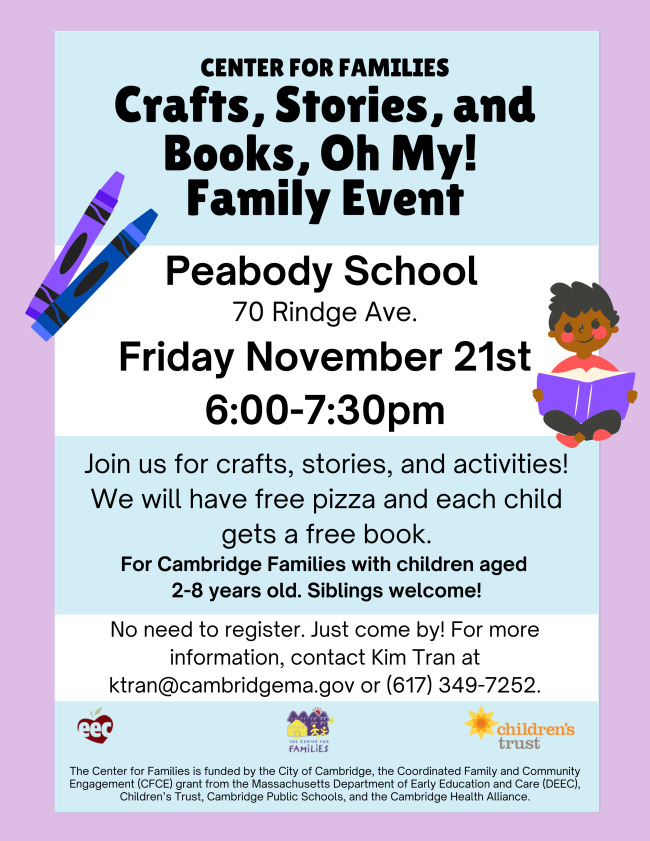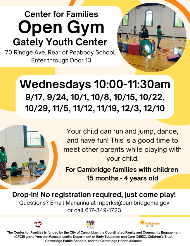 Center for Families staff can connect you to local agencies in Cambridge and surrounding communities for assistance ranging from education, food, housing, and much more. Reach out to our Case Manager, Silvia, to connect to local resources and supports: scote@cambridgema.gov for call 617-349-7208.