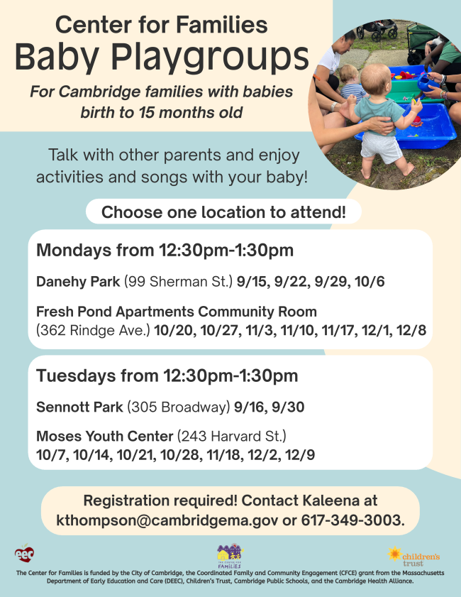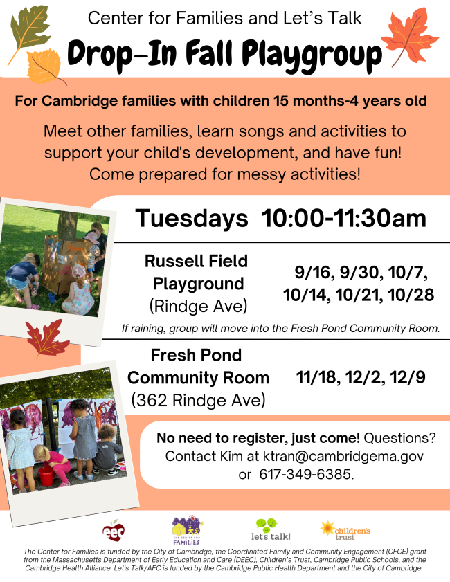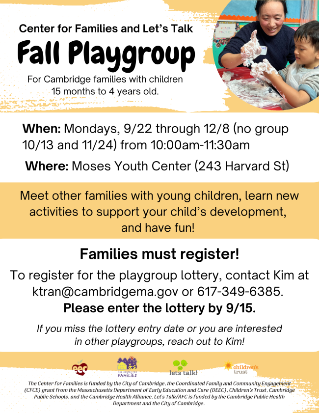 To register for the playgroup lottery, contact Kim at ktran@cambridgema.gov or (617) 349-1723.