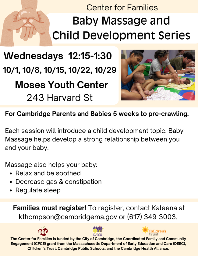 Massaging your baby helps develop strong relationships between you and your child, helps your baby relax, decreases gas and constipation, increases body awareness and maturation, and regulates sleep. For Cambridge families with babies 5 weeks old to pre-crawling.