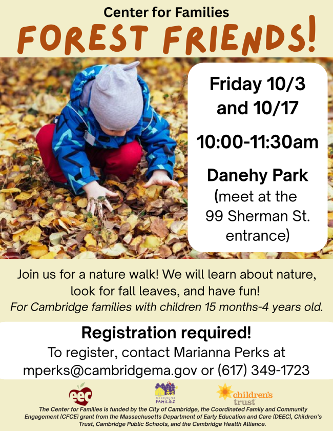 Join us for a nature walk! We will learn about nature, look for fall leaves, and have fun! For Cambridge families with children 15 months to 4 years old.