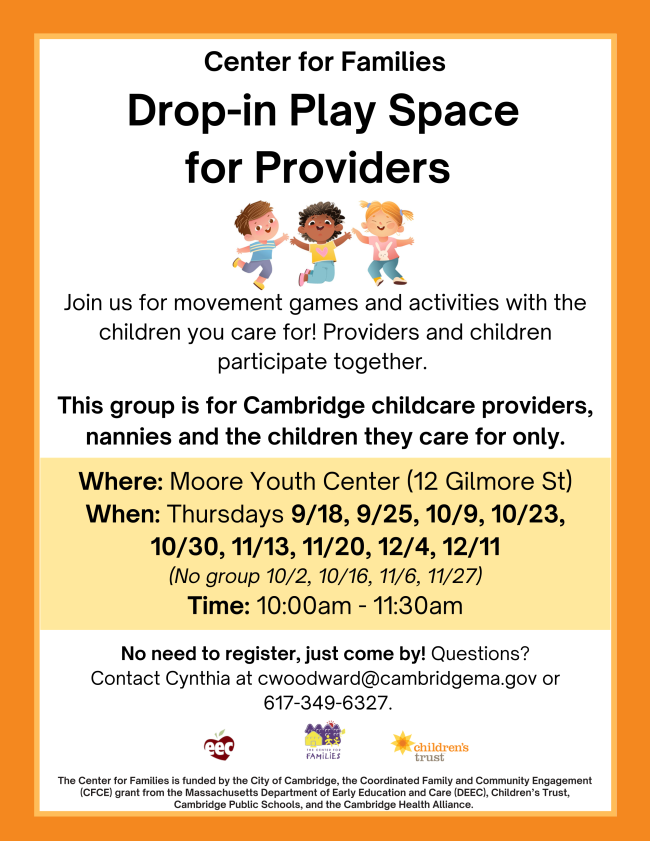 | | The Center for Families is funded by the City of Cambridge, the Coordinated Family and Community Engagement (CFCE) grant from the Massachusetts Department of Early Education and Care (DEEC), Children’s Trust, Cambridge Public Schools, and the Cambridge Health Alliance. | | | | |