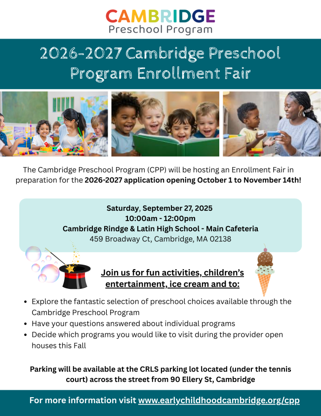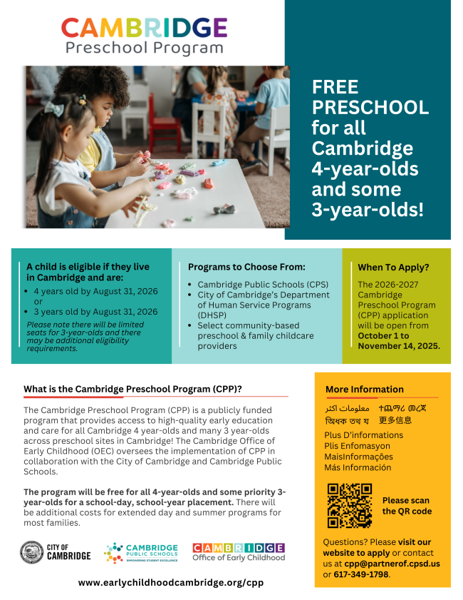 The 2026-2027 Cambridge Preschool Program (CPP) application will be open from October 1 to November 14, 2025.