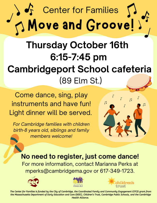 Come dance, sing, play instruments and have fun! Light dinner will be served. For Cambridge families with children birth to 8 years old. Siblings and family members welcome!