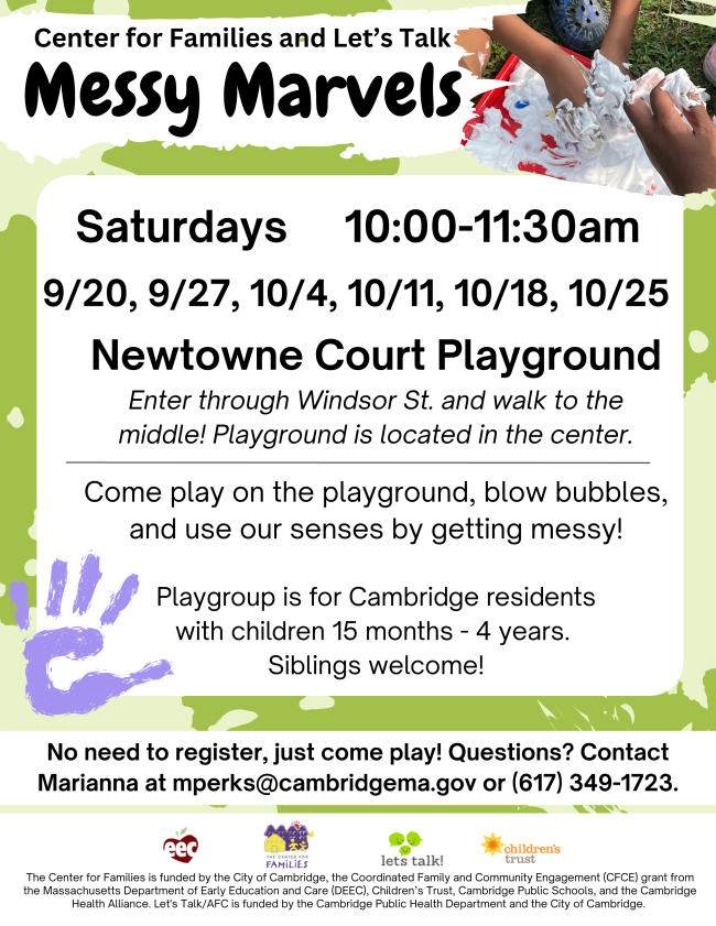Come play on the playground, blow bubbles, and use our senses by getting messy! Playgroups are for Cambridge families with children 15 months to 4 years old. Siblings welcome!