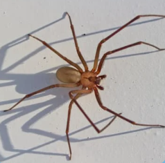 The brown recluse is also known as the “violin” or “fiddleback” spider, due to the dark violin-shaped marking on the dorsal cephalothorax. However, this feature is variable and not diagnostic, as similar markings occur in other species (e.g., cellar spiders, pirate spiders). A more reliable identifying feature is the unique eye pattern: six eyes arranged in three dyads in a semicircle, unlike the typical eight seen in most spiders (Repplinger, D.J. & Hahn, I., 2019).