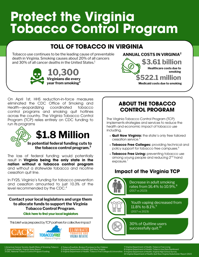 On April 1, HHS reduction-in-force measures eliminated the CDC Office of Smoking and Health - jeopardizing coordinated tobacco control programs and smoking quit hotlines across the country. The Virginia Tobacco Control Program (TCP) relies entirely on CDC funding to run its programs.