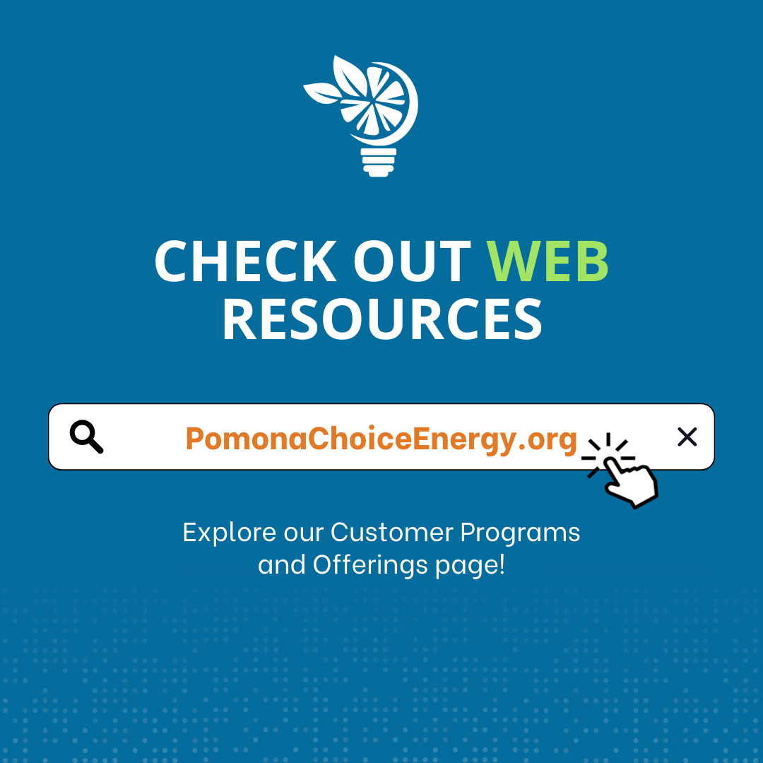 Finally, learn more about the resources available to you on the Pomona Choice Energy website. The site includes details on all Pomona Choice Energy programs, tips for saving on your power bill, and more!
