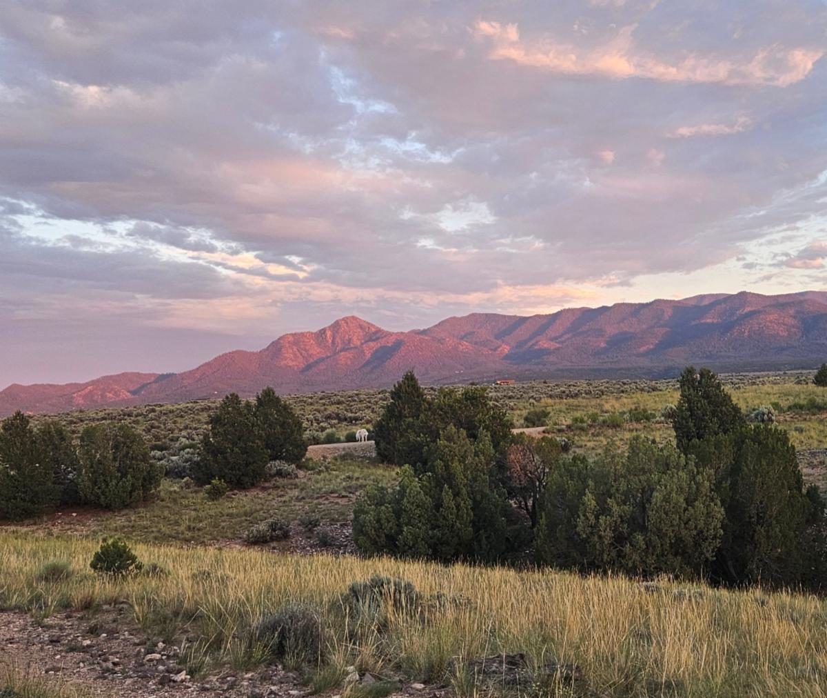 Our summer has been filled with light & good energy! We journeyed over 1100 miles to Taos, New Mexico to visit our son who moved to this enchanted area in March. We decided to drive rather than fly. It was a long ride, but we enjoyed the ever-changing scenery along the way ... from lush green fields to rolling hills to wide open "nothingness" to mesas & plateaus to our final destination where we were surrounded by mountains. The Sangre de Christos Mountain Range encircles the Taos area 360 degrees. In the daytime, so amazing, yet at sunset its spectacular red glow is overwhelmingly beautiful ... thus I understand their name ... "Blood of Christ" Mountain Range. I just felt so small yet incredibly blessed in the moment.