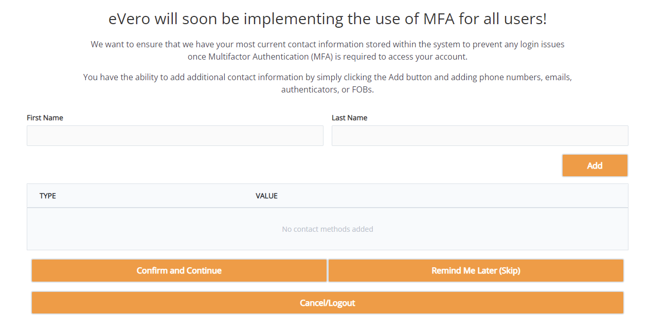 On Monday July 18th, you will be presented with a NEW pop-up screen when logging into the eVero system to ensure your readiness for MFA.