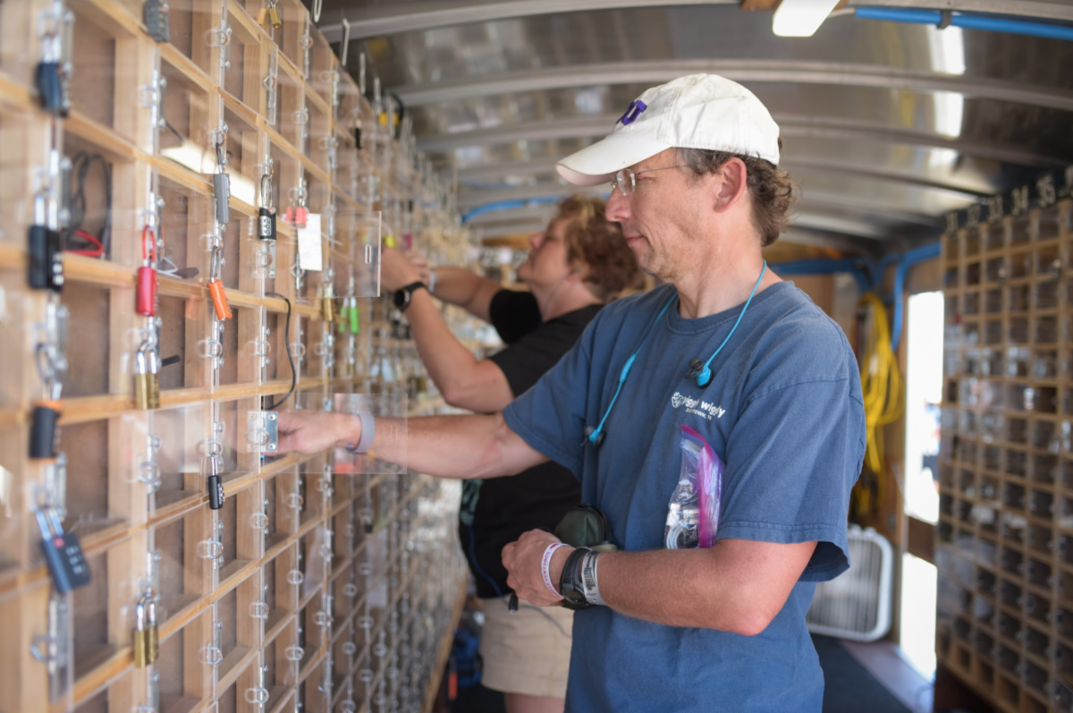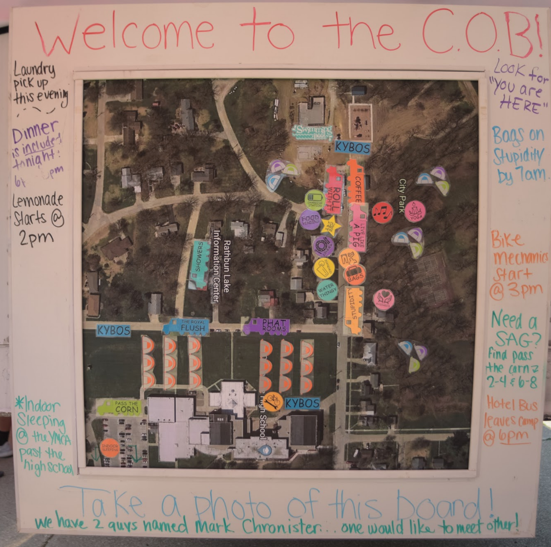 On the survey, lots of you mentioned the COB, short for Campground Orientation Baord, always at one end of our Front Desk trailer. Prior to RAGBRAI, Sara printed giant GoogleMaps of each day’s campsite and created moveable magnetic pieces to represent all parts of the Pork Infrastructure. One rider said "I no longer have to stand in line to ask where everything is. I can walk up to the COB, get oriented, snap a photo, and go on with my day."