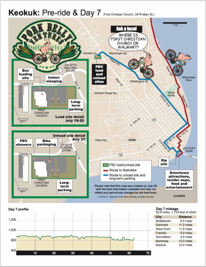 If I'm driving to the end town on Friday, what are my overnight options? Pork Belly Ventures always attempts to find inexpensive indoor camping in the end town. We have reserved church facilities, gymnasiums, schools, YMCAs, and other large rooms, where folks could make a small donation to roll out their sleeping bags indoors and relatively close to long-term parking. Last year in Keokuk, indoor sleeping (plus several meals) was offered by the kind congregation of our host church. Again this year, we will make every effort to arrange inexpensive indoor accommodations.