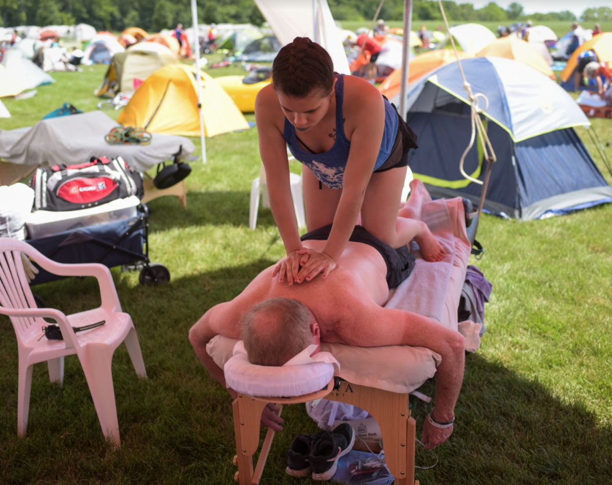 The Pork Belly Camping Experience As we continue to build custom equipment, we're up to 16 semi-trailers in the Pork Infrastructure now, with a growing variety of smaller special-purpose trailers custom-built to serve you. New shade canopies and different placement of canopies this year will add to the social zones in camp. The Misting Trailer houses misting fans to cool you down. The Massage Recovery Tent shelters ten therapists and an appointment desk. Our Bike Mechanics will be set up every afternoon and evening to serve you. We have mentioned banks of Kybos and our Restroom Trailer. We'll also place multiple Hand-Sanitizing Stations, our two Phone-Charging Trailers, the new Coffee Trailer, our Front Desk Trailer, and more on our campsites. Above, we mentioned the increase in PBV Shower Trailers. On RAGBRAI, Porkers, that's as good as it gets.