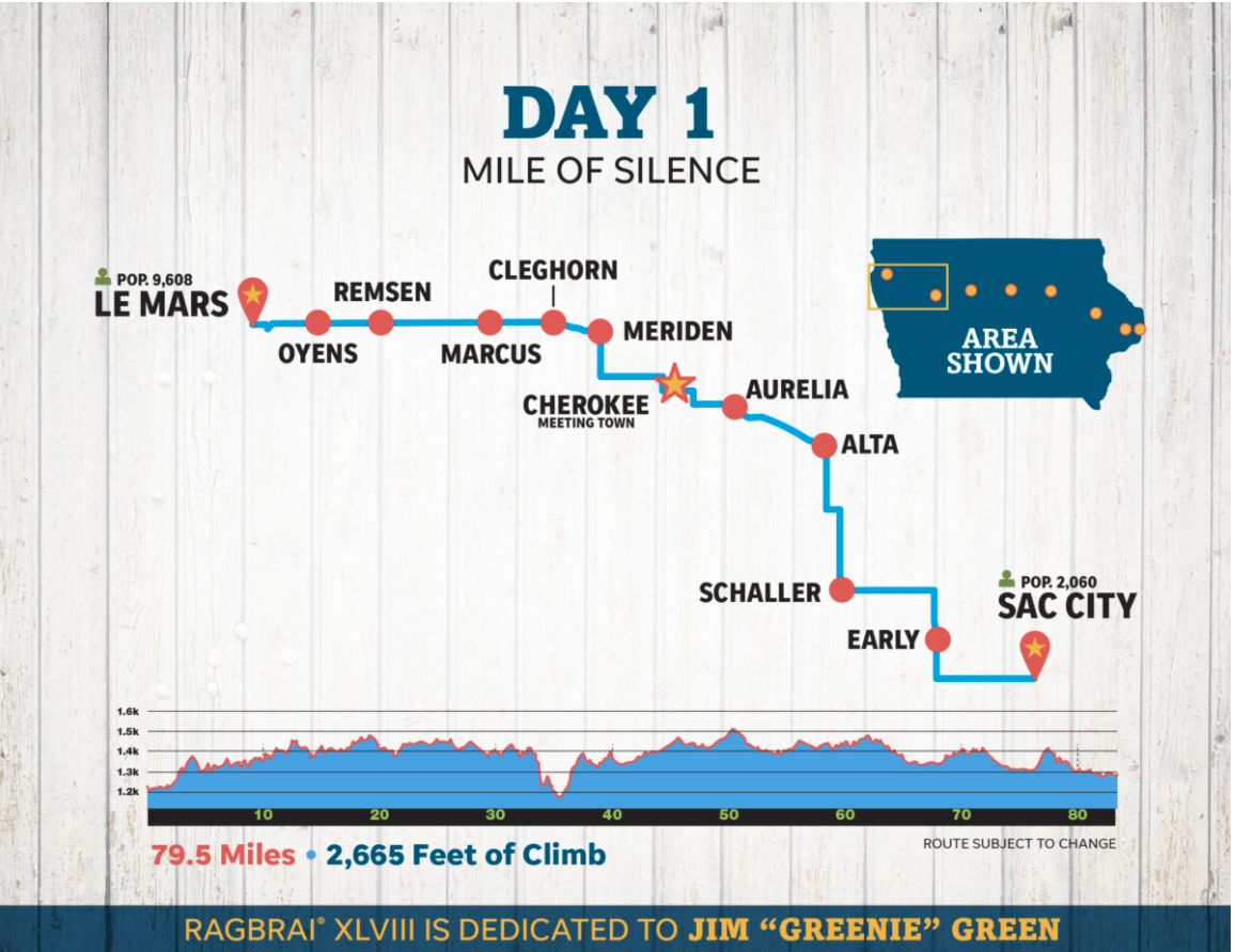 What's this year's slightly changed 2021 route? Any RAGBRAI veteran can tell you what riders love... a northern route through friendly small-town Iowa. This route is 426 miles. In the 48-year history of RAGBRAI, it's the 16th flattest. Here are the overnight towns and the daily mileage: