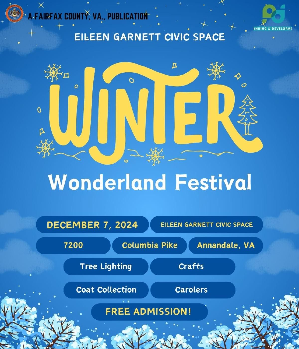 Join us for a Winter Wonderland Festival at the Eileen Garnett Civic Space from 3:30 to 6:30 p.m. on Saturday, December 7. This FREE event will feature tree decorating and lighting, hot cocoa and sweet treats, live music, children's activities, and a winter coat and clothing drive. Learn more.