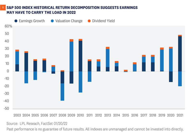 What about earnings as a potential catalyst? As we suggested in our 2022 Outlook: Passing the Baton, earnings growth would likely be the primary source of stock market gains this year. The downward pressure on stock valuations from higher interest rates makes that more likely.