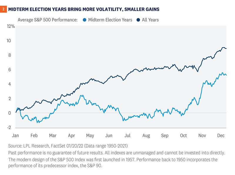 Although we would argue these midterms may bring less uncertainty than some others in recent decades given gridlock appears more likely than not to most political strategists, policy uncertainty is still there and the environment remains divisive. As a result, we would not be surprised if this year ended up looking more like the typical midterm year with mid-single-digit gains for stocks rather than double-digit gains, and a better second half than first half. It will take time for the biggest clouds to clear (COVID-19 and inflation) and stocks have historically seen very strong rallies after midterm elections pass.