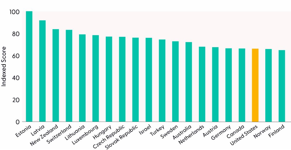 As this “new regime” takes shape, the U.S. has the opportunity to take advantage of change. In today’s globalized economy, the structure of a country’s tax system plays a crucial role in determining its economic performance. International tax competitiveness, which refers to how favorable a country’s tax policies are compared to others, can significantly impact both business and investment decisions. In times of economic slowdown, the policy response — which often includes monetary easing — should include business-friendly tax policies. Here’s why investors should carefully monitor for any progress on the tax front that lifts the U.S. from its 18th rank in tax competitiveness — currently behind other developed countries like Germany and Canada.