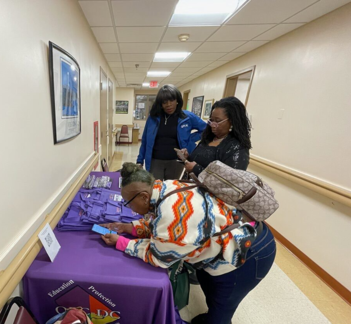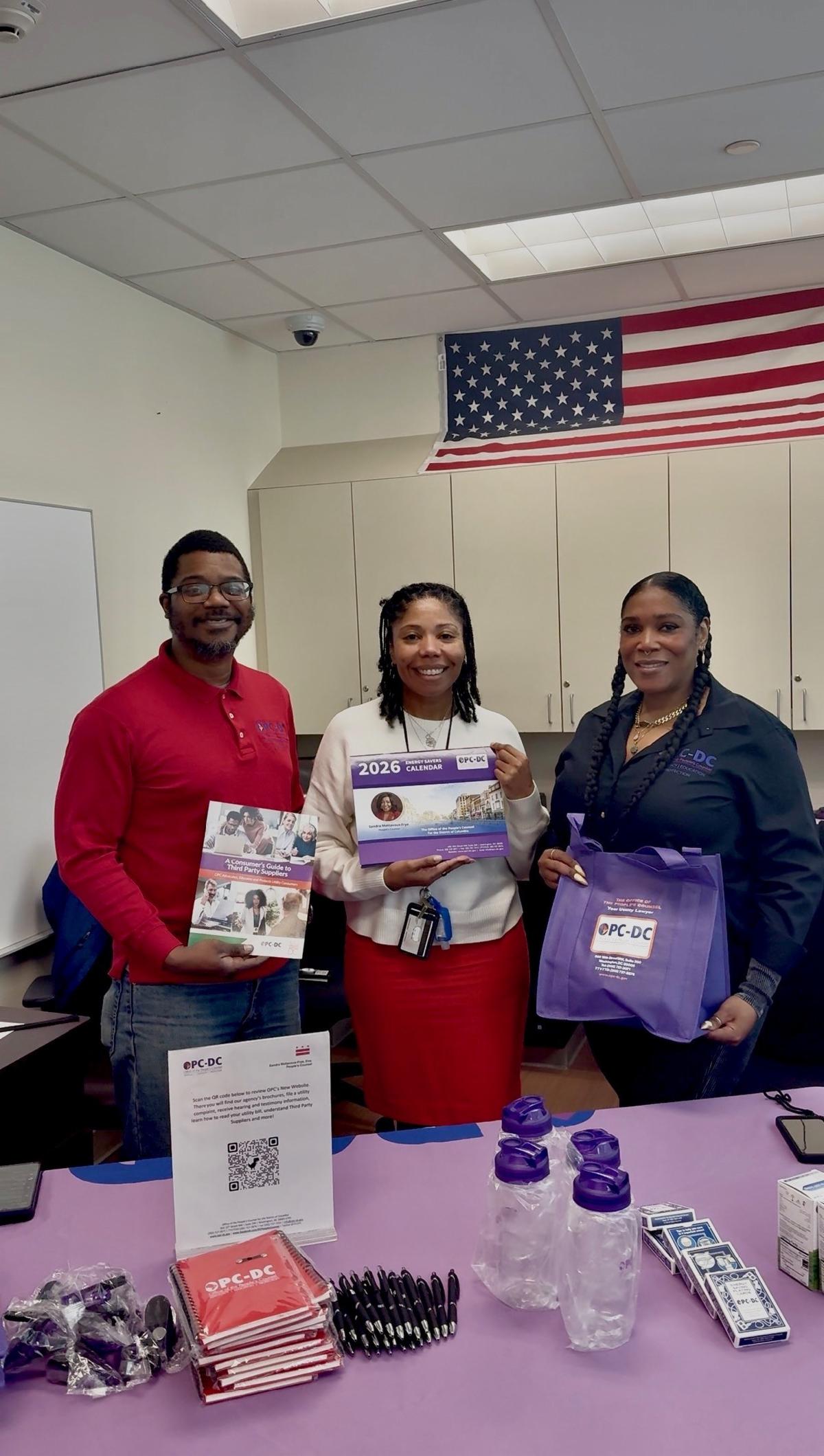 | | OPC's Jean Gross-Bethel instructs visitors at the Model Cities Senior Wellness Center in Ward 5 how to take the OPC solar survey. | | Ashley Roberson (center), a Case Manager at the U.S. Veterans Affairs Community Resource Center in Ward 5, with OPC's Jason Starks and CharQuia Barringtine. | | OPC's Deja Harrison and Claire Shibelski above, and George Gilbert below, explain how OPC serves utility consumers at the National Association of Minority Contractors Expo at the University of the District of Columbia. | | OPC's Jean Gross-Bethel and CharQuia Barrington participate in LIHEAP Action Day, an education and advocacy event where consumer advocates meet with members of Congress and staff to highlight the importance of the Low Income Home Energy Assistance Program. | | |