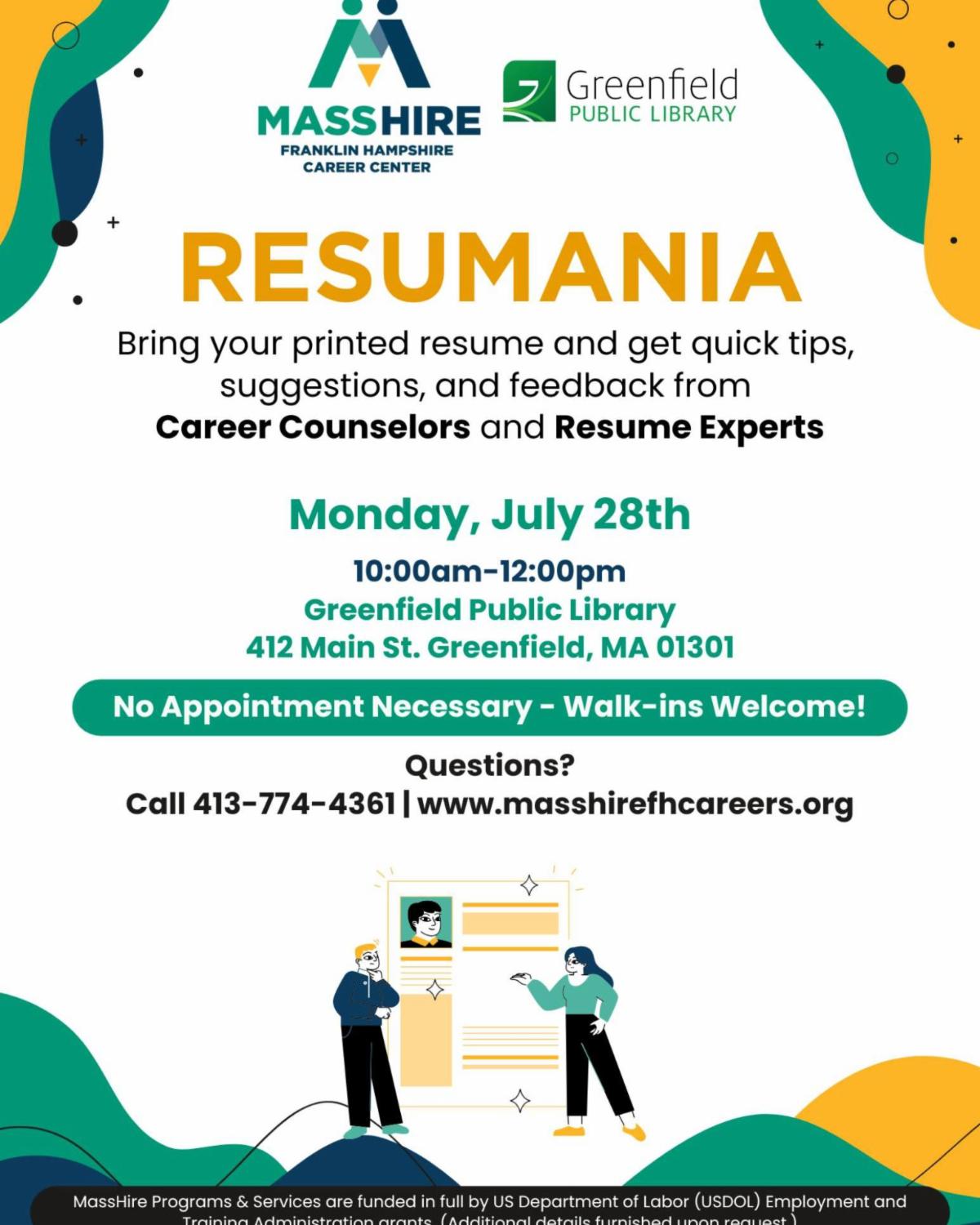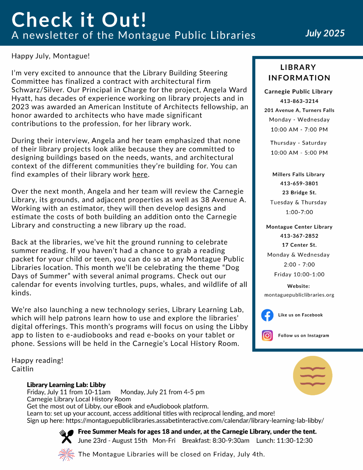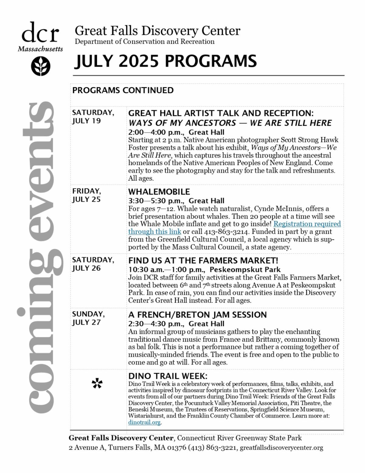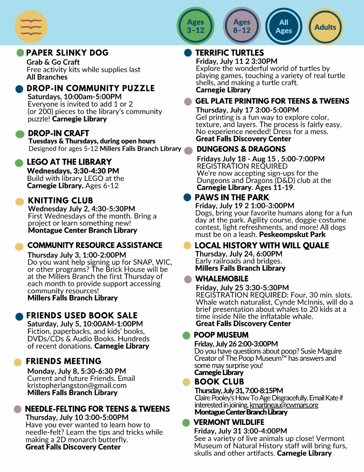 | | July 30 & August 6 Touchpoints Parenting | | July 31 & August 7 Active Parenting-The First Five Years | | July 31 Job & Resource Fair- Celebrating Mature Workers | | July 31 The Hilltown Ham Hocks | | August 2 Nature Walk: Explore The Plants Of Leverett | | August 2 Hilltown History Trail | | August 2 & 3 Pocumtuck Homelands Festival | | August 4 Pre-Registration End Date for Youth Golf Clinic | | August 4 Snack and Screen: Shrek | | August 5 Blooming Backpacks Drive | | August 5 National Night Out | | August 6 Make a Pokemon Trainer Belt! | | August 6 Summer Reading Stuffy Sleepover | | August 7 - 10 HYRT Presents: Twelfth Night | | August 15 WHWHE: Belly-licious | | |