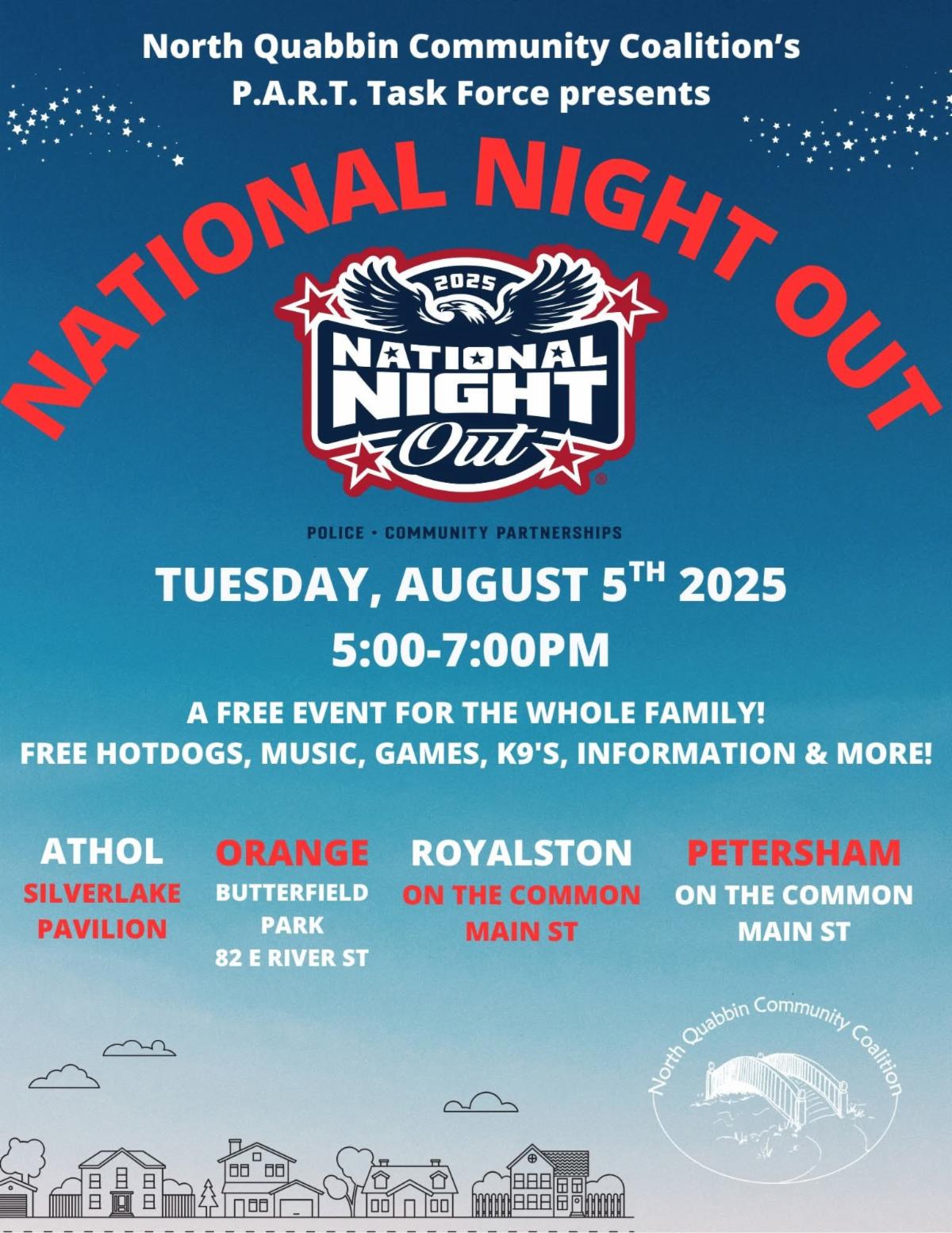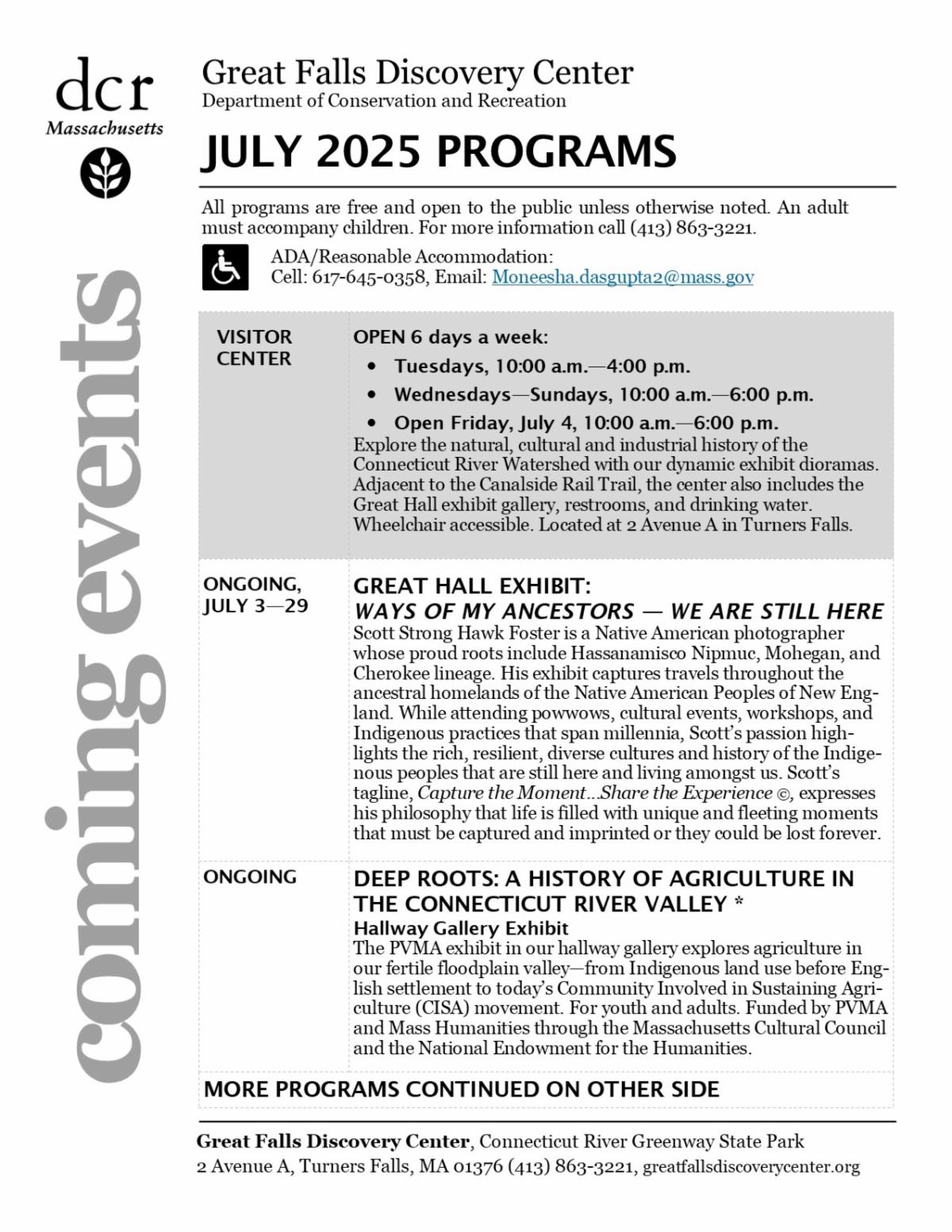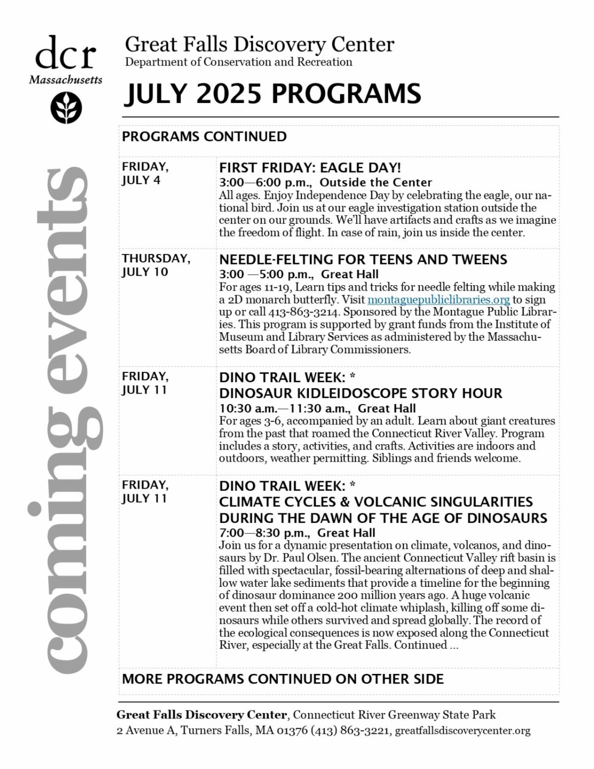 | | Click here for Post-Opioid Overdose Outreach Services | | Time Sensitive Announcements | | Now - August 10 Erving Public Library Summer Reading | | Now - August 20 Wild About Water Wednesdays | |