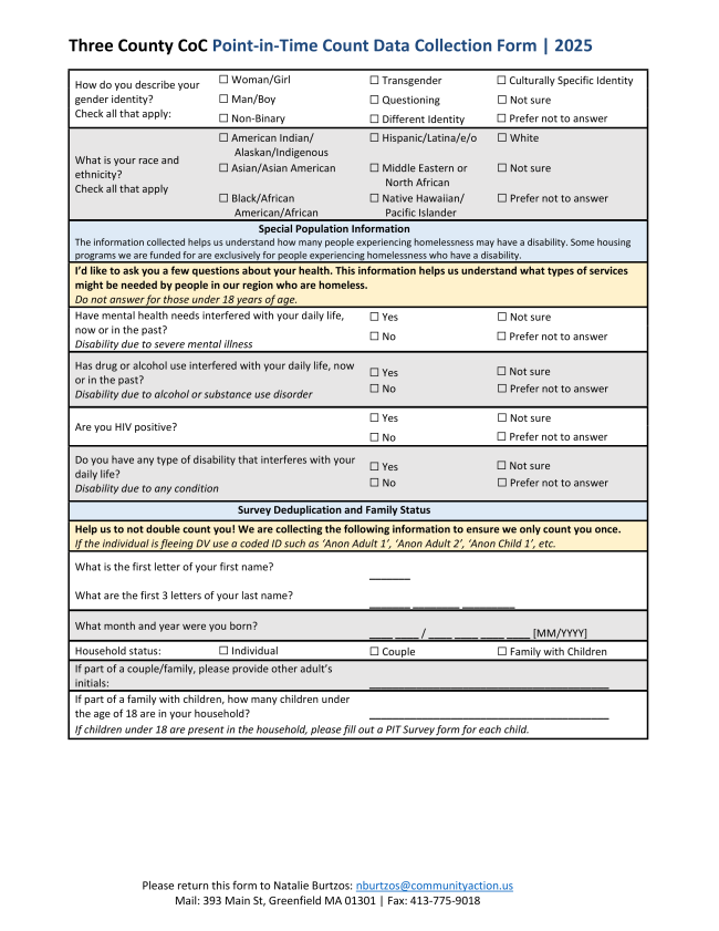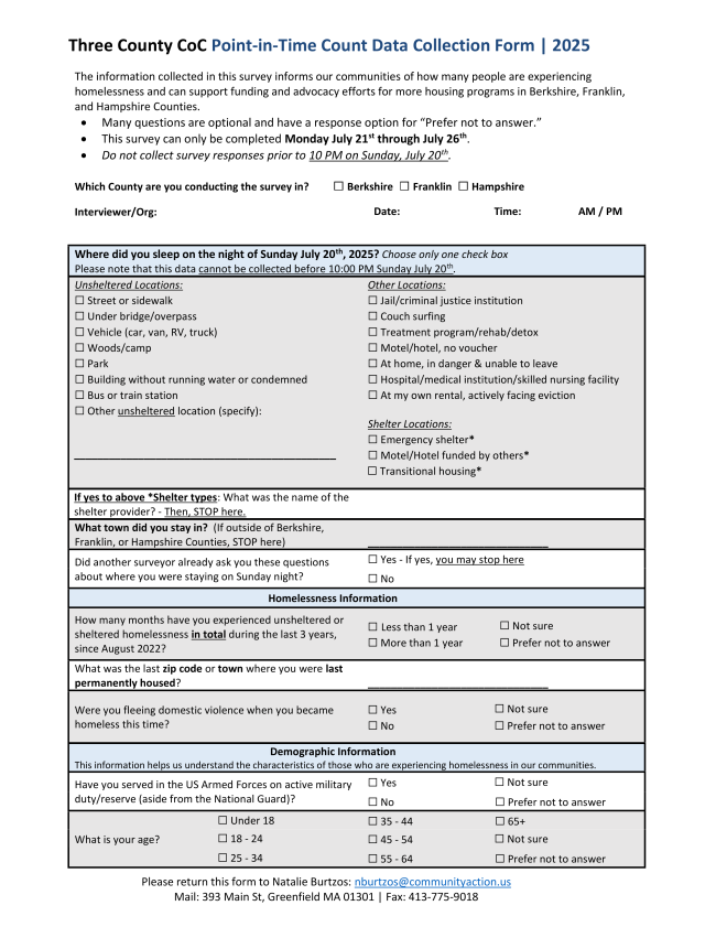 The Three County CoC is carrying out a Summer Point in Time (PIT) Count of people experiencing unsheltered homelessness in Berkshire, Franklin, and Hampshire Counties.