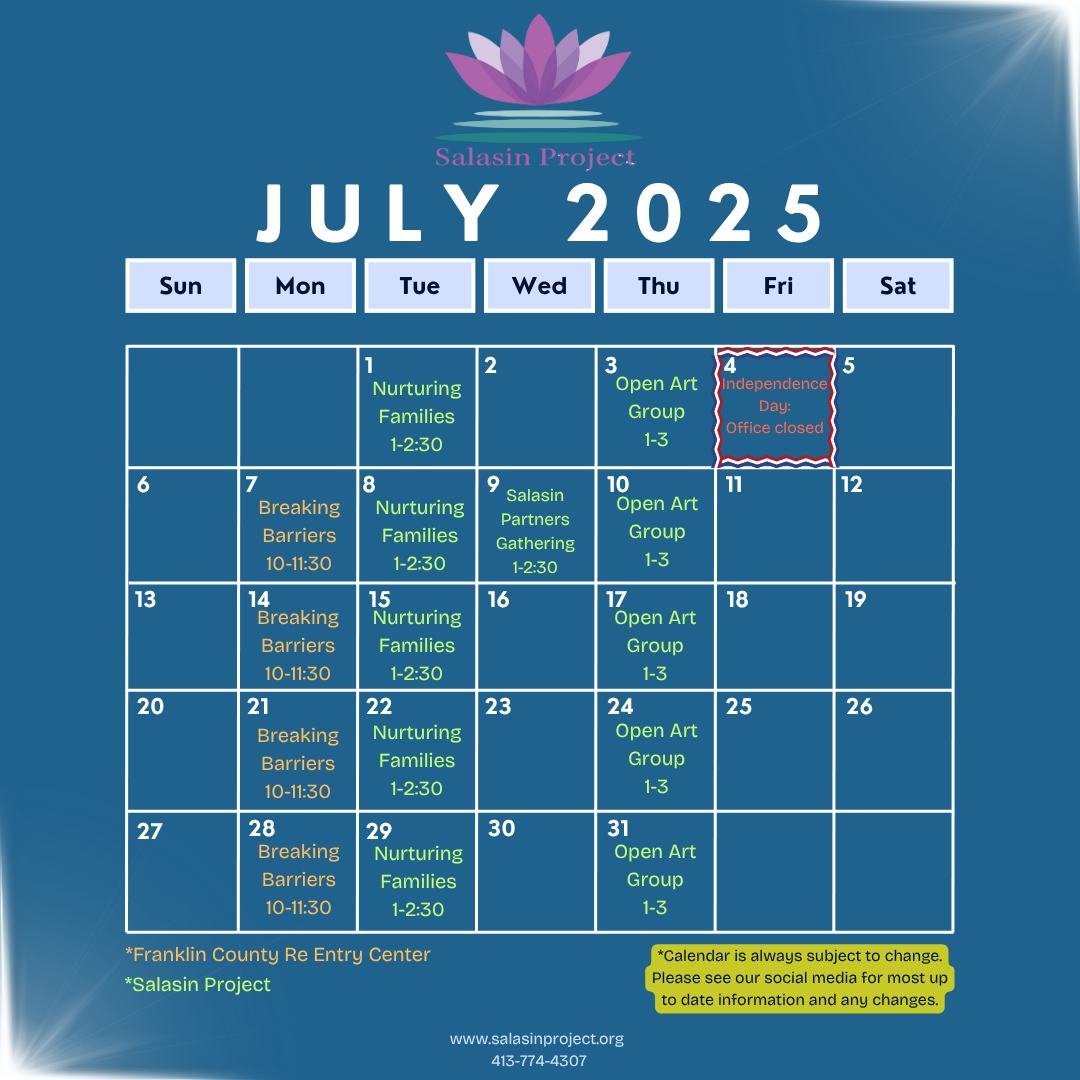 | | Wednesdays Virtual All Recovery Meeting | | Wednesdays BIPOC ALT2SU (Alternatives to Suicide) | | Wednesdays - Wendell Library Playgroup with Sylvia | | Wednesdays - Playgroup at the Leverett Library with Gillian | | Wednesdays HEROES Study Hub at GCC | | Wednesdays Health Connector & Mass Health Navigator Drop In Hours | | Wednesdays Face The Storm Men's Group | | Every Other Wednesday (beginning March 5) Salasin Project Housing Support | | First Wednesday Gentle Yoga and Breathwork with Jennifer | | First Wednesday - Money Wise Financial Education Sessions | | Third Wednesday - Fatherhood Meetup | | Last Wednesday - Office Hours With An Attorney | | Wednesdays and 2nd Saturdays The Nest Community Closet | | First Thursdays Through November Ukulele Monthly Class | | First & Third Thursdays Parent Support Group | | First & Third Thursdays Eagles Meeting | | Thursdays Through August 28 Bilingual Music & Movement | | Thursdays Music Tween Group | | Thursdays Coffee Hour at the Brick House | | Thursdays Beyond Trauma Group in Spanish | | Thursdays Windows and Mirrors Playgroup | | Second Thursdays -Peer Grief Support After Overdose Death | | Second & Fourth Thursdays Community Meeting | | Third Thursdays Court Service Center Walk-in Days at the North Quabbin Patch | | Fridays FreeWrite of Franklin County | | Friday All Recovery Meeting and Drop In Recovery Coach Support | | RECOVER Project Friday Nights | |