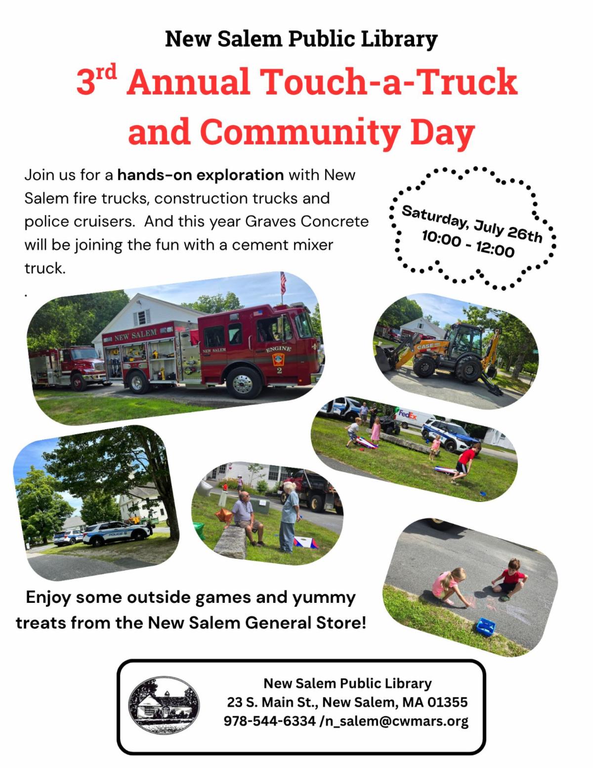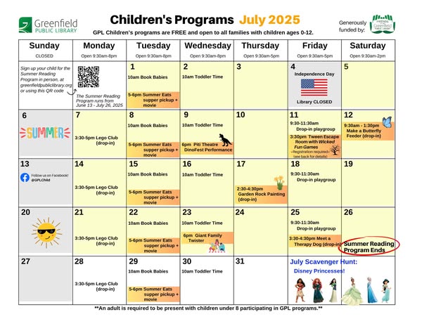 July 25 Summer Concert Series: Ragtime Five Quintet | | July 26 Dad Bags: DIY Sail Boats | | July 26 3rd Annual Touch-a-Truck and Community Day | | July 26 Making Food Fun with CISA | | July 26 Abundance Dance Party & Cookout | | July 26 Extension Cords II | | July 27 WHWHE: Cooking with Gratitude: Local to Global | | July 28 Snack and Screen: Into the Spider-Verse | | July 28 Marshmallow Roasting | | July 29 Arthropod Petting Zoo | | July 29 Your Library, Your Voice | |