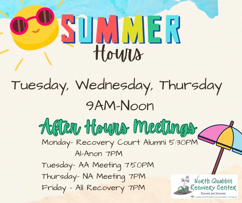 Tuesdays Nurturing Program for Families in Recovery | | Tuesdays Peer-Led Grief and Loss Circle | | Every Other Tuesday - Housing Support Drop In Hours | | First Tuesday - Dads' Group | | Tuesday Tea Time & Community Resource Drop-In | | Tuesdays North Quabbin Recovery Center Coffee Hour | | Tuesdays Greenfield Suicide Loss Group | | First Tuesday - P.A.R.T. Task Force | | Tuesdays Drop-In Knitting & Sewing Sessions | | Tuesday & Thursdays Weekly Reentry Groups | |