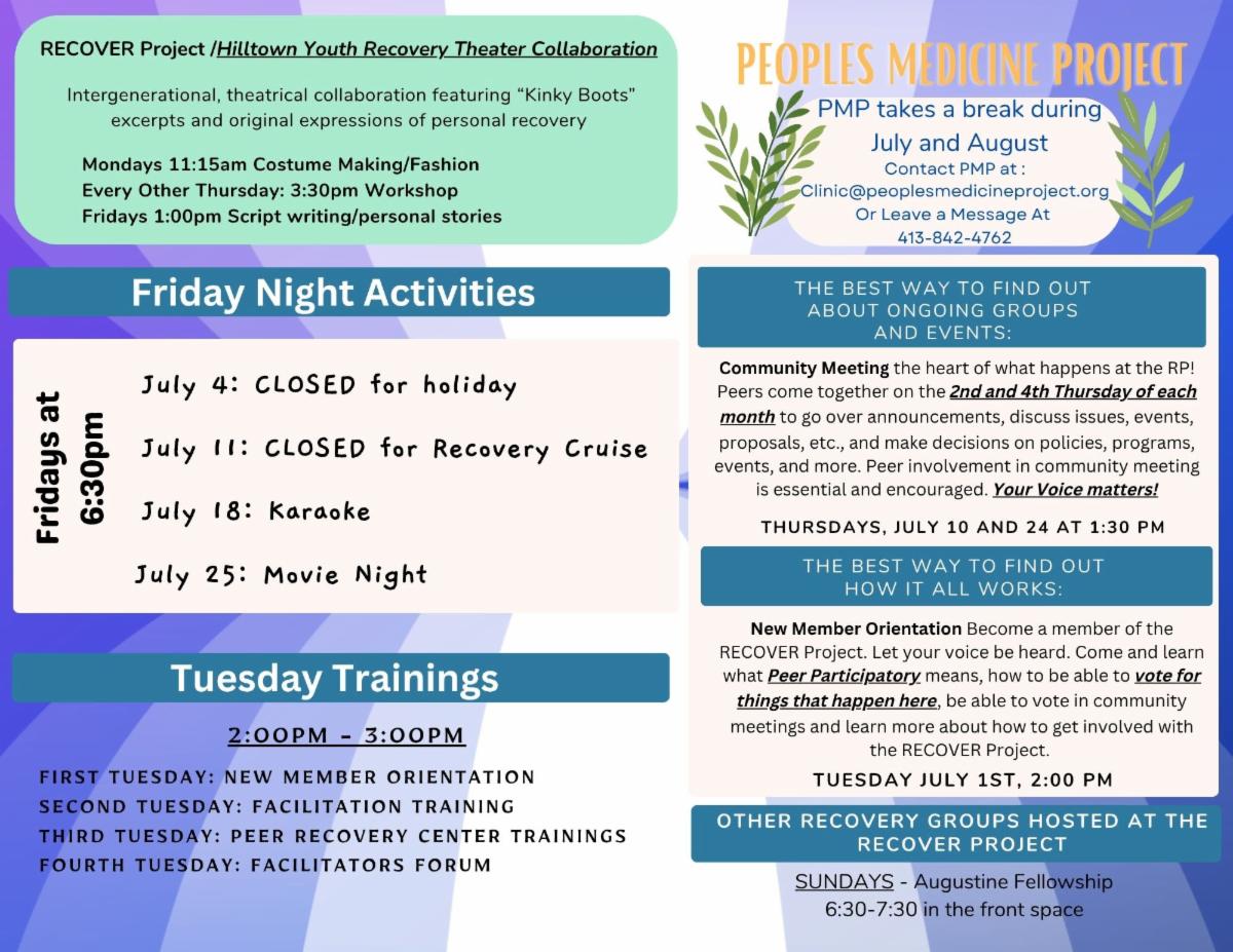 | | Hilltown Youth Recovery Theatre | | Montague Public Library Programs | | North Quabbin Recovery Center | | Seeds of Solidarity and Women Healing Women Healing Earth | | The Shelburne Falls Military Band | | Union 28 Community Network for Children Program | | Housing Help With Greenfield Housing Authority | | SNAP Application Assistance | | Always Open! Community Labyrinth in Greenfield | | What's Happening at The NQRC | | Sundays ALT2SU (Alternatives to Suicide) | | All Recovery Meeting at The RECOVER Project | | |