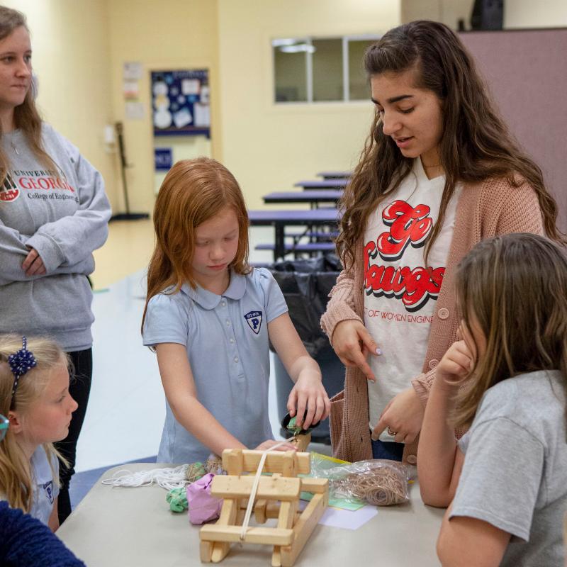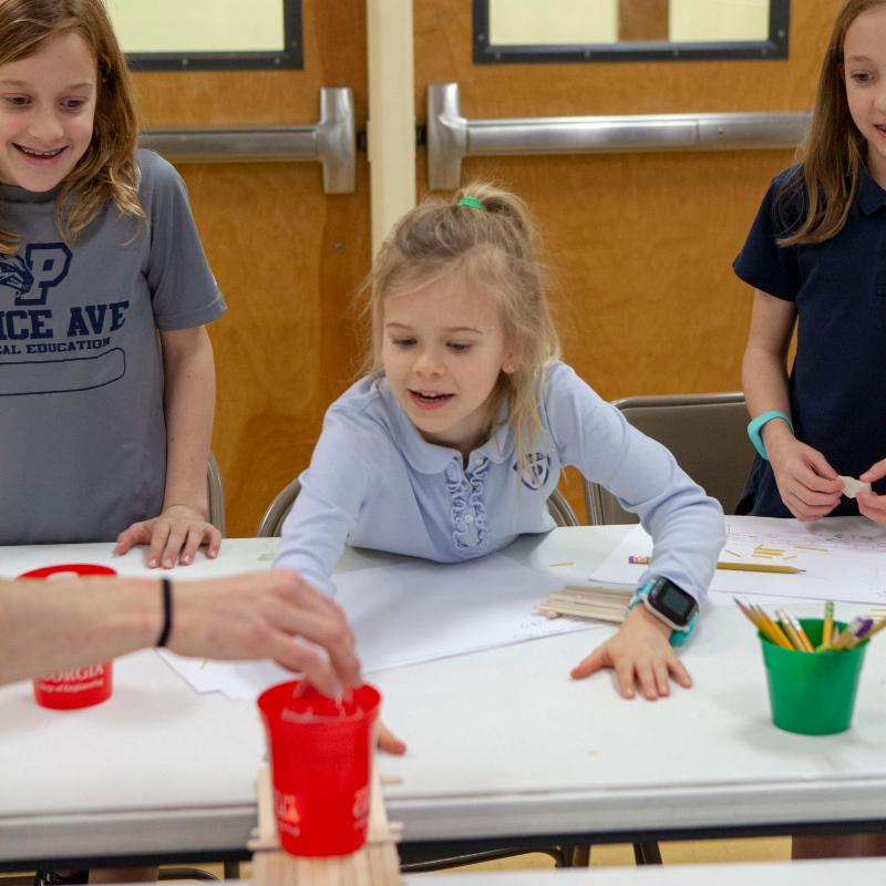 Prince 3rd – 5th-grade girls recently had the unique opportunity to participate in “Introduce a Girl to Engineering Day” (Girl Day). Girl Day was sponsored by volunteers with the University of Georgia Student Chapter of the Society of Women Engineers (SWE) as part of the broader Engineers Week that promotes recognition among parents, teachers, and students of the importance of a technical education helping to motivate youth to pursue engineering careers. The program involved an introductory video, snacks, and three stations focusing on three different engineering disciplines.
