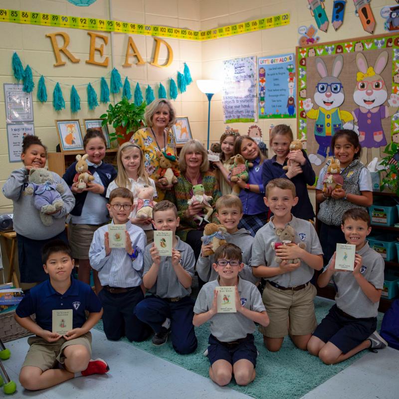 After learning about the life and works of Beatrix Potter, Mrs. Padgett's second-grade students enjoyed a visit from Carole Johnson, a friend of Mrs. Padgett who is originally from England. Mrs. Johnson has an extensive collection of Beatrix Potter books and collectibles. Students enjoyed Mrs. Johnson's beautiful English accent as she read Beatrix Potter stories to the class. She also shared pictures of England and of the home of Beatrix Potter called Hill Top.