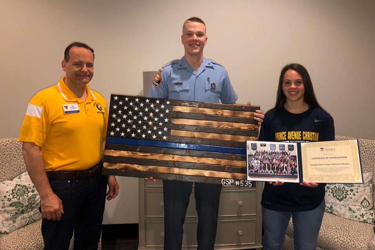 Prince alumni Jordan Ginnel (’16) and Nathaniel Wooten (’12) were recently presented with a gift of appreciation from Prince Avenue Christian School for their work as troopers with the Georgia State Patrol. Prince junior Nealie Cook created a work of art in honor of TFC Ginnel and TFC Wooten as a reminder of Prince Avenue's gratitude for their service.