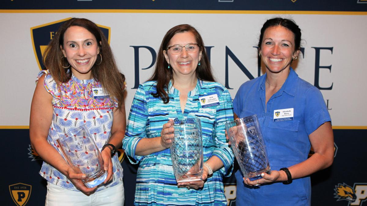 Lower school teacher Mary Beth Minor, middle school math teacher Beth Schroeder, and high school history teacher Elizabeth Barry are the 2021-2022 Prince Educators of the Year. Each received a crystal vase and a cash donation which are given each year by a generous and anonymous donor.