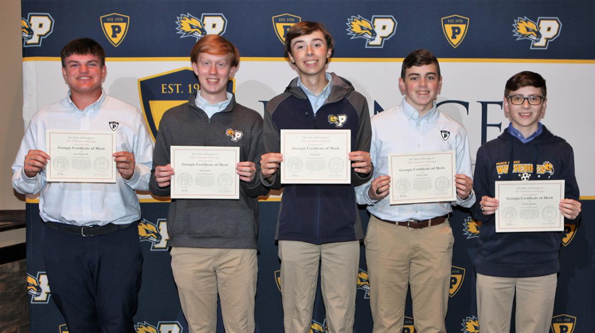 Prince Avenue Christian School juniors Cooper Capps, Wade David, Hayden Melton, Rett Sams, and Ross Whitworth were recently recognized as 2022 University of Georgia Certificate of Merit Award winners. The Georgia Certificate of Merit is given in recognition of outstanding scholastic achievement in the first three years of high school in the hope that such recognition will result in even greater academic effort and full pursuit of a formal program of higher education. These students are following a college preparatory with distinction curriculum and rank in the upper five percent of the current juniors attending PACS.