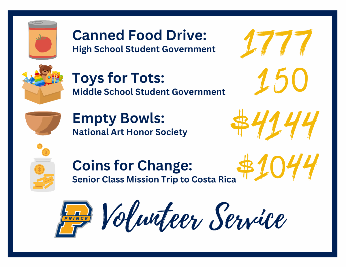 Prince juniors and seniors served in multiple areas of the community and school during the High School Day of Service held on November 22nd. Students were divided into teams that served at Fish Monroe Thrift Store and Food Pantry, Chosen for Life, Arbor Terrace, Bigger Vision, the school-wide canned food drive, and Prince Grandparents Day. Prince values the partnerships with these organizations and the opportunities students have to serve. | |