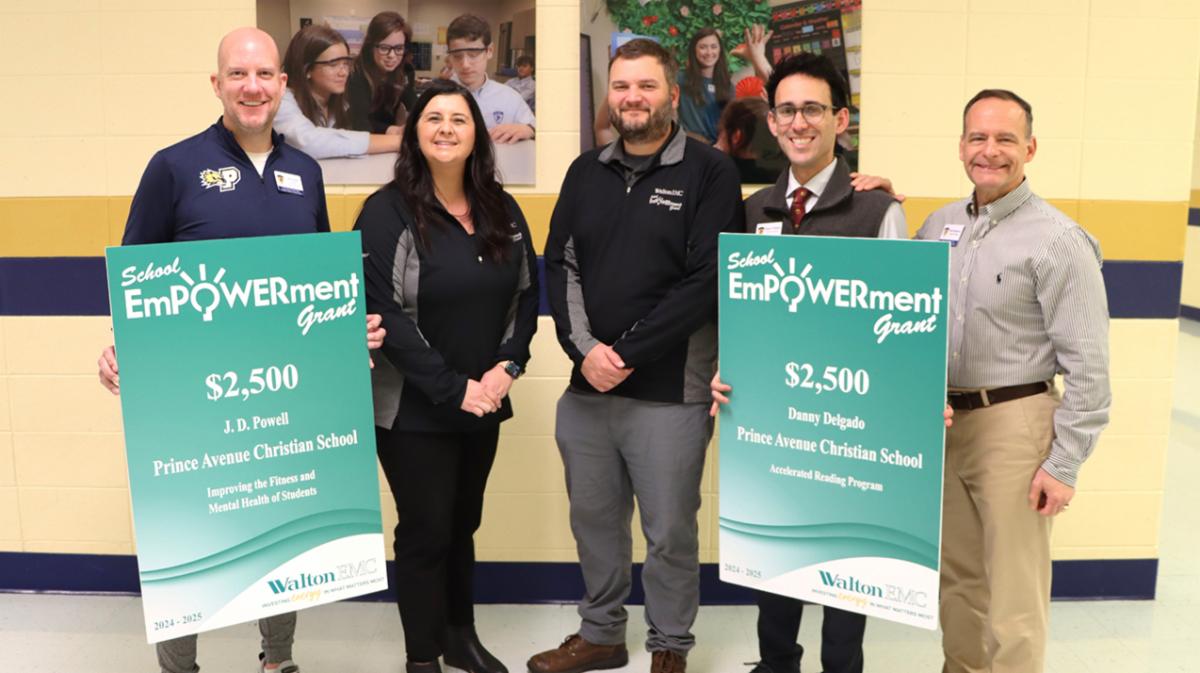 Prince Avenue Christian School was recently awarded the Walton EMC School Empowerment Grant which will provide funding for two different initiatives. Assistant Athletic Director JD Powell received $2,500 to be used toward improving student fitness and mental health, and Librarian Danny Delgado received $2500 for the Accelerated Reader program. Presenting the grants were Prince parent and Walton EMC Communications Coordinator Savannah Chandler and Member Service Specialist Pete Ervin. Walton EMC’s School Empowerment Grant Program gives schools in nearby communities the opportunity to boost their instructional and service programs by funding worthwhile projects. | |