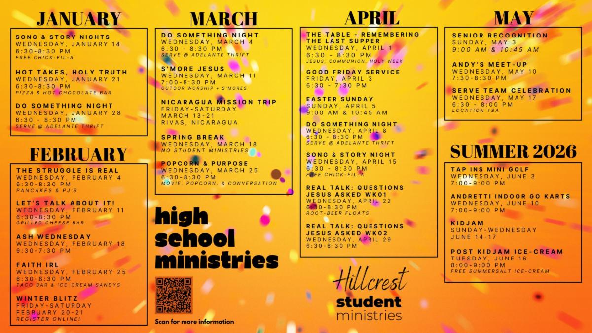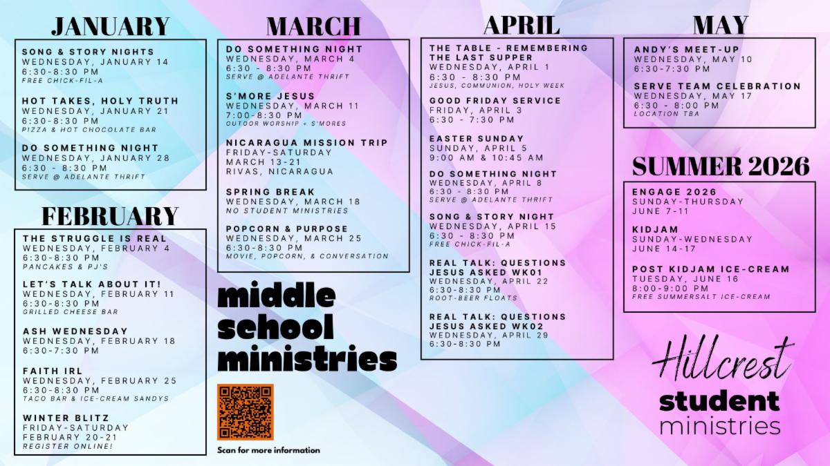 | | Check out what's happening with students at Hillcrest! Click to see Middle School or High School calendar for what's just ahead this winter and spring. | | |