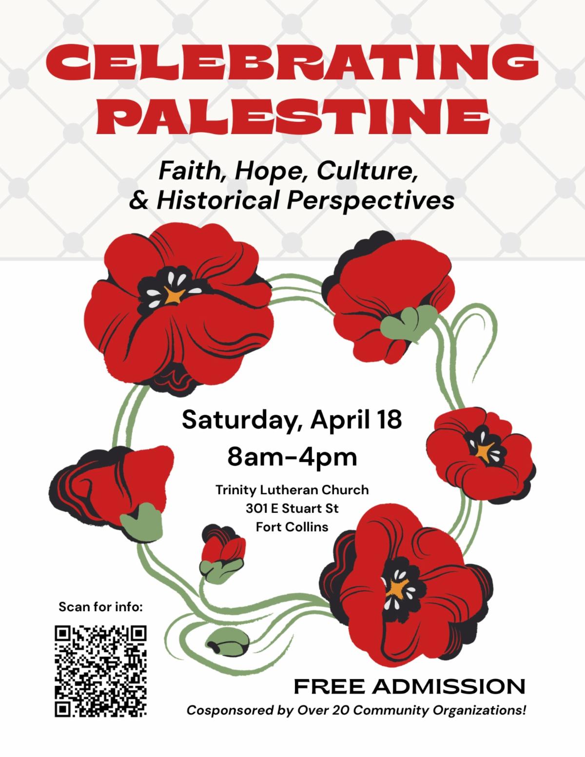 Over thirty community and faith organizations are hosting a celebration of Palestinian culture at Fort Collins’ Trinity Lutheran Church (ELCA) on Saturday, April 18, 2026.