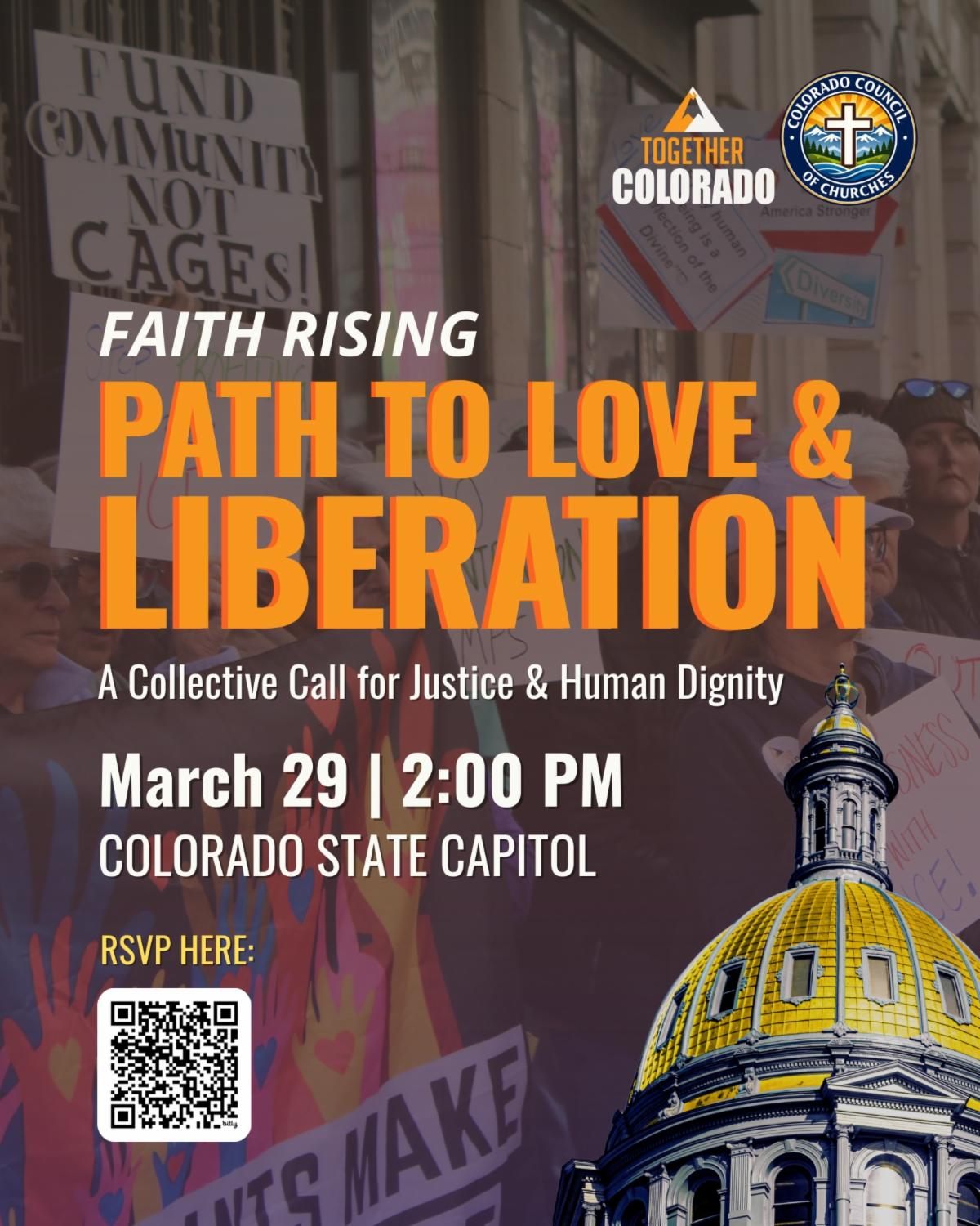 On Palm Sunday, March 29, join Together Colorado for Faith Rising: Path to Love & Liberation, from 2:00–3:30 p.m. at the Colorado State Capitol West Steps. This gathering will bring together people of faith and conscience for prayer, public witness, and action in support of love, liberation, and the dignity of every person. Bishop Meghan Johnston Aelabouni will offer the closing blessing. | | | | |