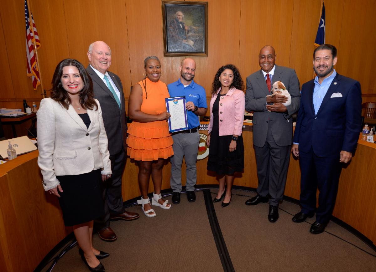 Pet Preparedness Awareness Month: Commissioner Garcia presented a resolution to highlight the importance of preparing pets and their families for major weather events. Corey Steele, Associate Director of the Veterinary Public Health Division, Harris County Public Health, and a four-legged friend accepted the resolution.