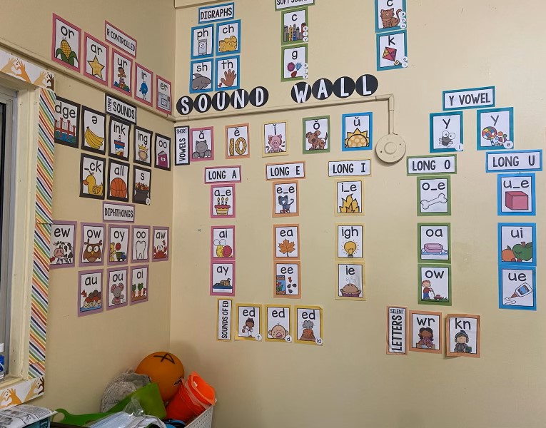 Because many Hunt students live with attention and focus challenges, many teachers experiment with special furniture and sensory equipment. Each classroom has a basket of fidget items students can choose from, and there are bands that attach to the bottom of desks, allowing students to bounce their legs while remaining seated. Many teachers install a strip of sandpaper under the ledge of the desks for sensory stimulation. There are also non-traditional chairs available, and zones in each classroom where students can go either to regulate or to get their work done.